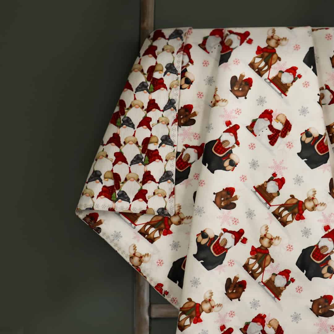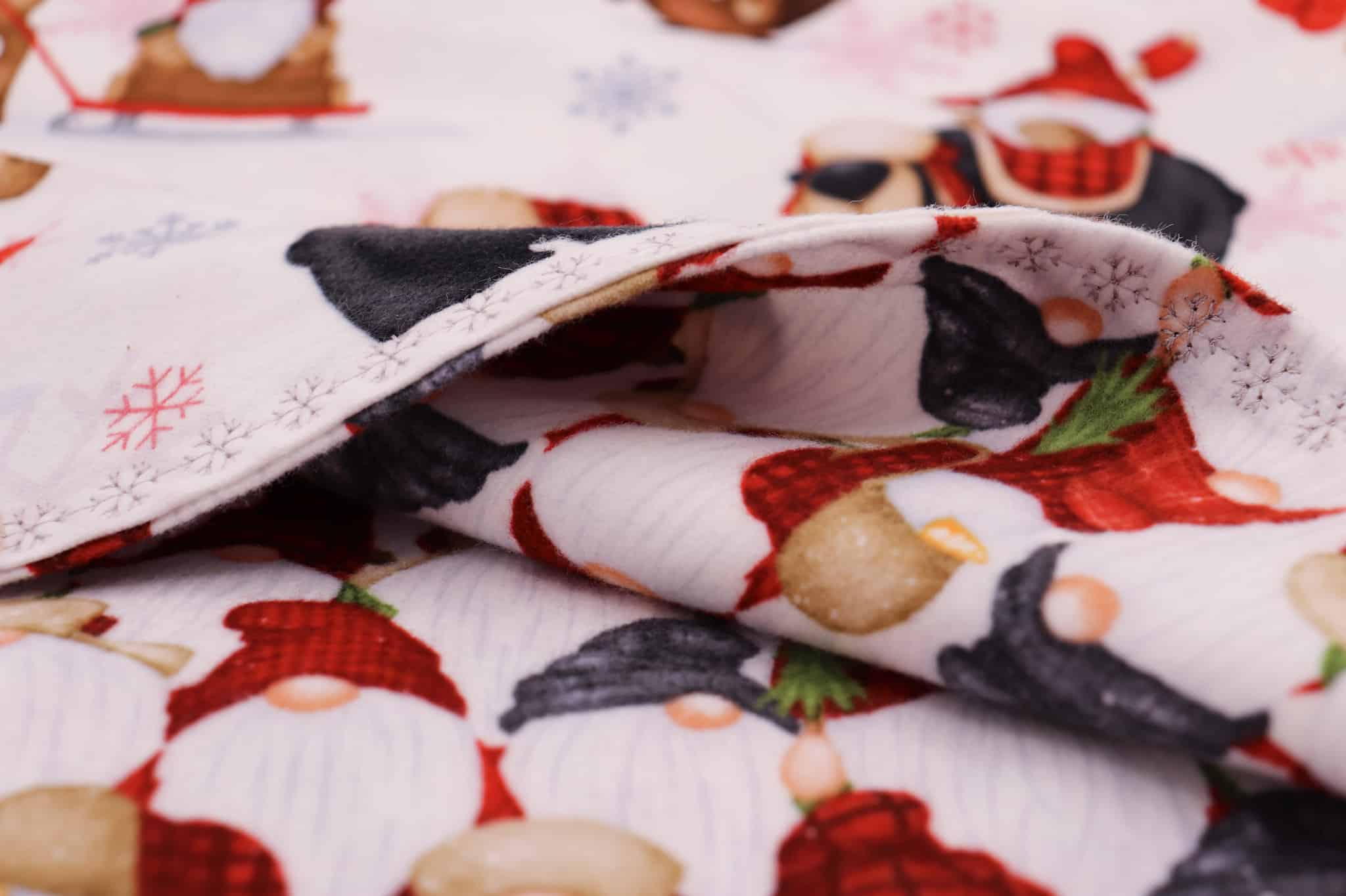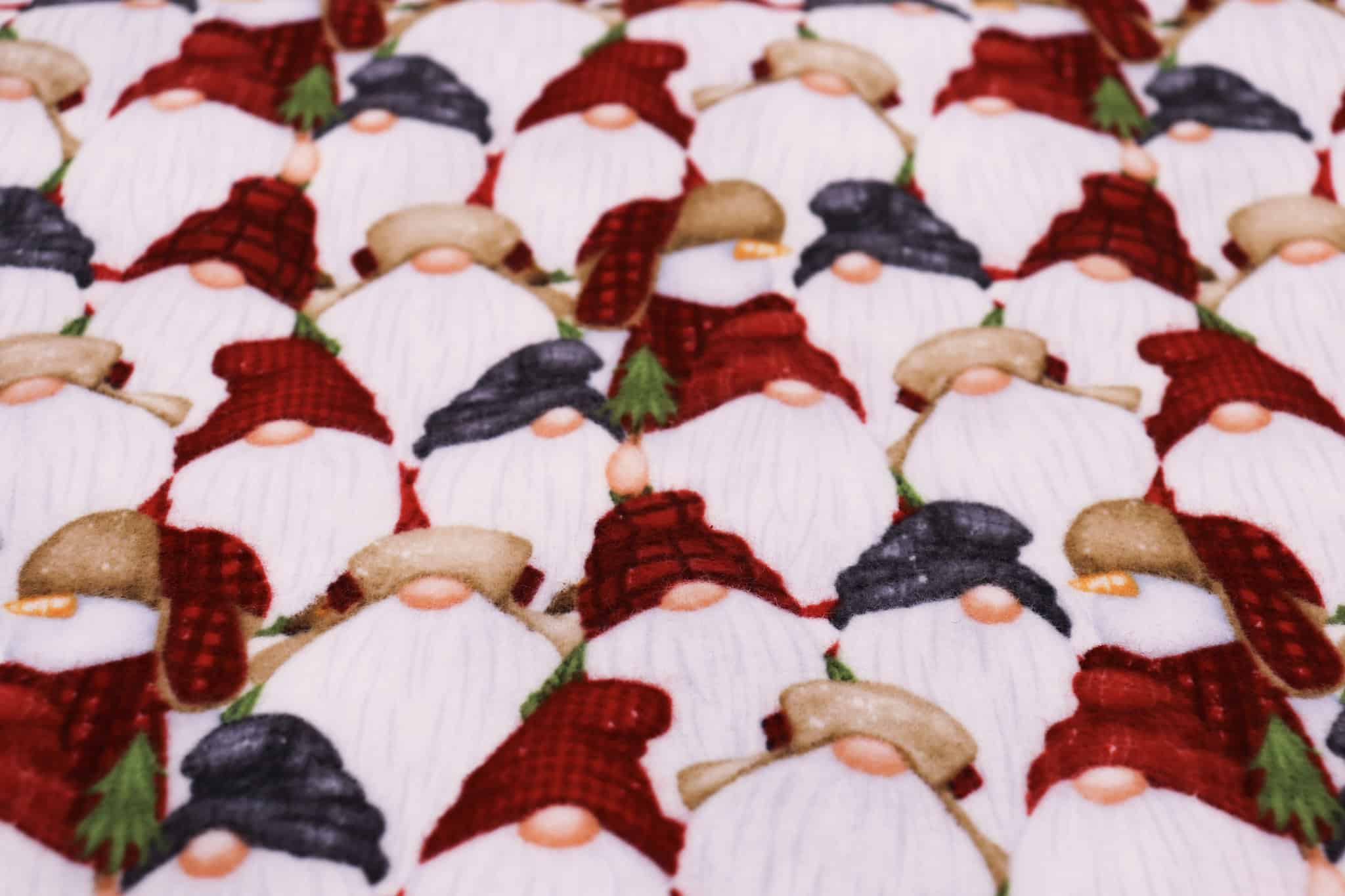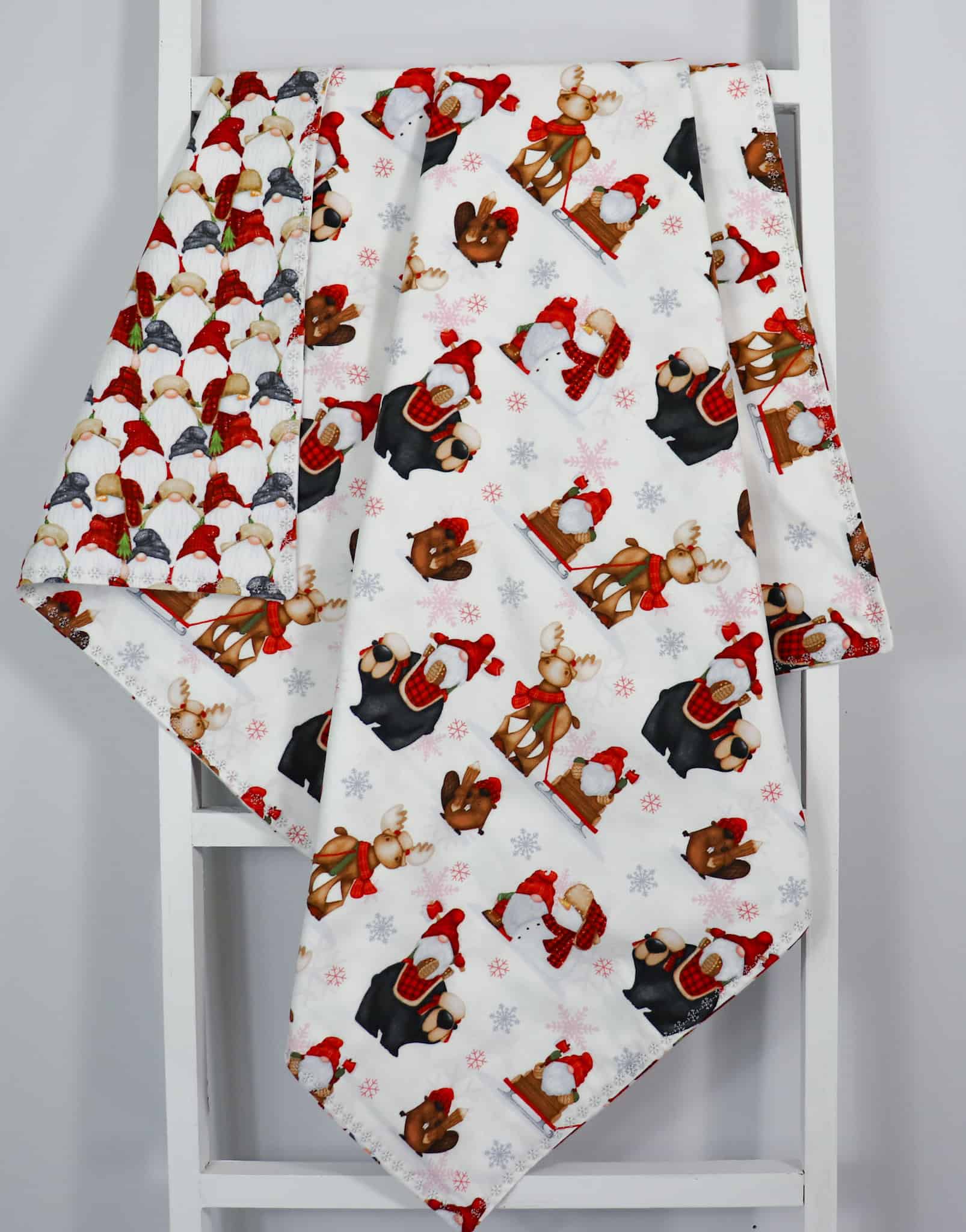 How cute are these gnomes! This unique blanket is made of premium oh so soft cotton flannel. Both the front back fabrics are covered in adorable winter gnomes and the snowflake edging stitch is the perfect finish to this one of a kind blanket.
